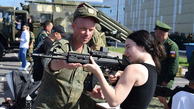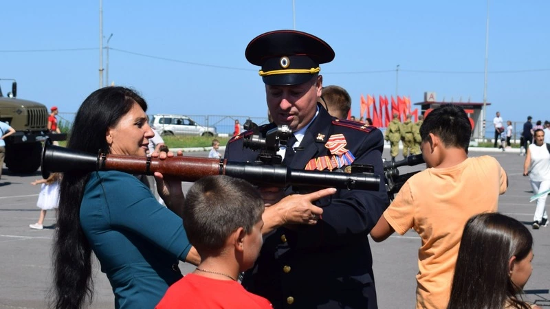 За полчаса до начала торжественного митинга стали появляться гости – это приехал автобус из Рейдова. Пока на сцене военный духовкой оркестр проводил последние репетиции, гости, среди которых добрая половина – дети, принялись осматривать военную технику и стрелковое оружие.