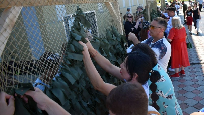 К этой акции присоединились и стар, и млад, люди разных профессий и социального статуса. На первых снимках – только начало, но уже спустя час, дело почти завершено. Таким образом появились несколько маскировочных сетей, которые будут отправлены в зону СВО.