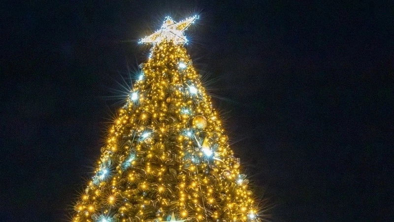 Эта сказочная конструкция высотой 20 метров и весом немногим более двух тонн была куплена в 2023 году. Стоимость на тот момент составляла 3,9 млн рублей. Ее ветки также выполнены из морозоустойчивой и пожаробезопасной лески, всего их 2 105 штук. Также дерево украшено 636 красными и золотистыми шарами.