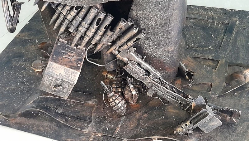 К примеру, основа экспоната – хвостовик от реактивного снаряда «Смерч», который прилетел из расположения ВСУ в село Никольское на подворье местного монастыря, но, по счастью, не разорвался; в нижней части находится пулемёт ПКМ – он был изъят при штурме села Новомихайловка; автоматы АК-47 были обнаружены в блиндажах, гранаты – в окопах, на отвоёванных у врага позициях. Есть даже отстрелянная ПТУР (противотанковая управляемая ракета) и хвостовики мин, прилетевших в сторону российских подразделений.